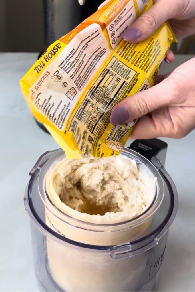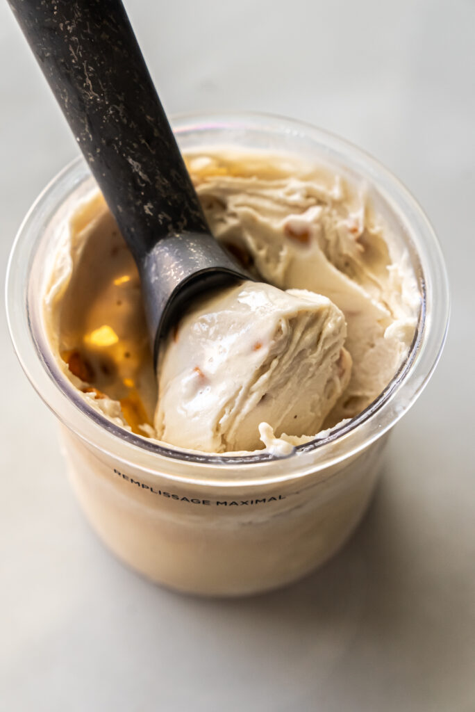 - Run the Ninja Creami on the lite ice cream function. After one spin, make a hole and add 1 Tbsp of butterscotch chips. Press the mix in button.